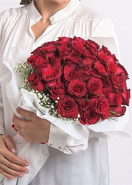 33 adet kırmızı gulden ve cipso çieçğinden hazırlanan buket