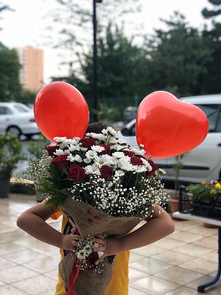 Balon & Papatya & 10 Adet Kırmızı Gül